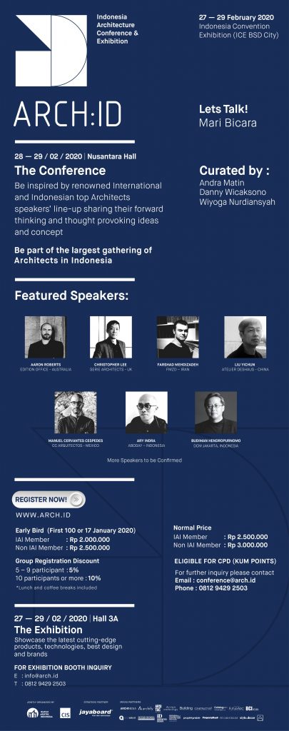 Mengangkat tema Let’s Talk! “Mari Bicara”, ARCH:ID (Indonesia Architecture Conference & Exhibition) akan diselenggarakan pertama kalinya pada 27-29 Februari 2020 di Indonesia Convention Exhibition (ICE), BSD City, Tangerang. Kegiatan ini merupakan hasil kemitraan strategis antara Ikatan Arsitek Indonesia (IAI) dan PT Citra Inovasi Strategi (CIS). Kegiatan yang akan terbangun di ARCH:ID akan meliputi Konferensi & Pameran yang akan menjadi wadah dialog berkelanjutan antara Arsitek dan para pelaku industri konstruksi di Indonesia.